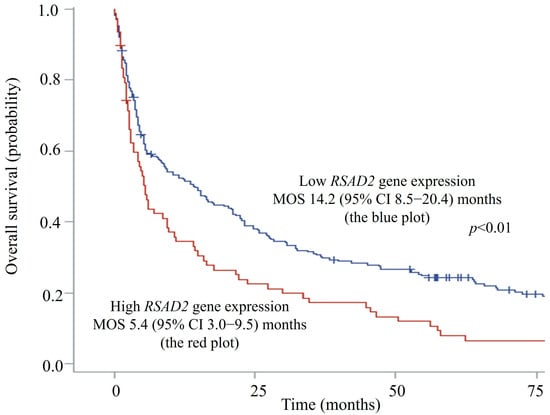 The median RSAD2 mRNA transcript level in patients’ circulating leucocytes was 1.16 (interquartile range 0.33–2.89) FC. Since RSAD2 gene expression demonstrated an asymmetrical skewed distribution, expression levels of more than the 75th percentile (2.89 FC) were ranked as high to facilitate risk of death analyses using Cox models. Seventy-six patients had high RSAD2 gene expression in peripheral blood, whereas 233 patients had low expression. The median OS was significantly shorter in patients with high RSAD2 gene expression when compared to those with low RSAD2 expression, 5.4 (95% CI, 3.0–9.5) vs. 14.2 (95% CI, 8.5–20.4) months, respectively (log-rank p < 0.01). Figure 2 shows the Kaplan–Meier survival curves of patients with respect to RSAD2 gene expressions.