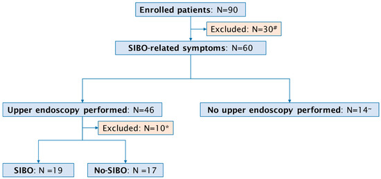 Flow chart of study population. # Absence of SIBO-related symptoms; * inadequate duodenal aspirate; ~ death before procedure (N = 7), severe infections (sepsis, cholangitis) preventing endoscopy (N = 7).