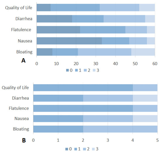 (A) Severity and impact of SIBO-related symptoms on quality of life of patients with active or past upper GI cancer. (B) Severity and impact of SIBO-related symptoms on quality of life in patients with SIBO after treatment with Rifaximin. Symptoms were rated on a scale from 0 (no symptoms) to 3 (severe symptoms).