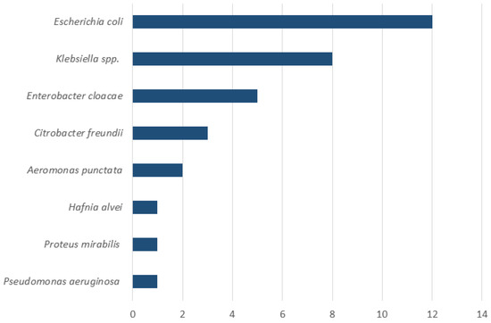 Composition of duodenal aspirates in patients with SIBO (n = 19). The X-axis indicates the number of patients. Note that multiple bacterial species could be isolated from the same patient.