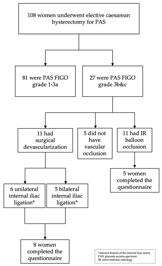 To investigate the long-term outcomes, the women were contacted by post or email, inviting them to participate. In the absence of a response after two weeks, a further letter or email was sent, but no further contact was attempted thereafter. Patients were sent a participant information sheet, consent form, and a questionnaire. The questionnaire is included in the Supplementary Materials (File S2). It was aimed at addressing complications stemming from the abdominal incision, pelvic devascularisation, and bladder reflection. Upon returning the signed consent form, a call was arranged at a mutually convenient time for questionnaire completion. The same researcher (LP) conducted all the interviews according to a pre-defined interview structure, clarifying the question if there was any difficulty in understanding it and exploring the response if there was uncertainty. At the end of the interview, the women were asked if there was anything they wished to discuss and were signposted to medical help if this revealed any issues (such as psychological distress, which is common among PAS patients). Women declining participation had their information removed and were not re-contacted.