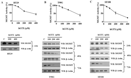 Concentration-dependent inhibition of MGMT activity and MGMT degradation induced by hGTX in human colon cancer and brain tumor cells. Modification of the active site Cys145 in MGMT inactivates the DNA repair and the resulting protein undergoes degradation. (A) Inhibition of the DNA repair activity of cellular MGMT by increasing hGTX concentrations. HT29 cells were first treated with hGTX at concentrations shown for 24 h. Cell extracts prepared therefrom were used for determining the DNA repair activity of MGMT (upper panels) and the loss of MGMT protein by Western blot analyses. (B) T98G cells; (C) SF188 cells. (Whole blot See Figure S1).
