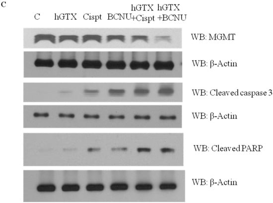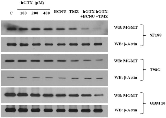 MGMT deficiency induced by hGTX alone and hGTX + alkylator combinations in glioblastoma cell lines. Tumor cells were treated with either hGTX alone or preincubated with 100 μΜ hGTX followed by BCNU (100 μM) and TMZ (750 μM) for 24 h. The results show a marked downregulation of MGMT protein. (Whole blot See Figure S2).
