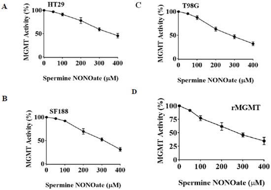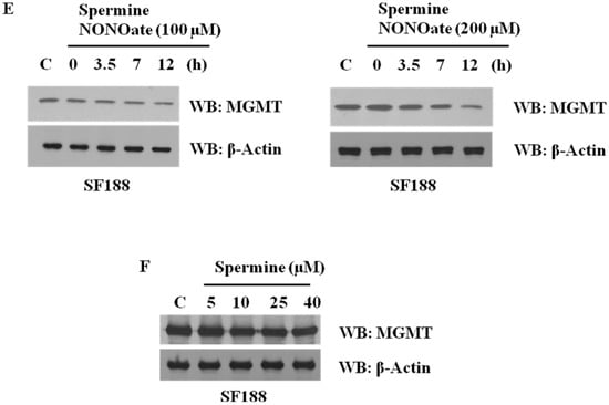 Concentration-dependent inhibition of MGMT activity and MGMT degradation induced by spermine NONOate in human colon tumor and brain tumor cells. (A) HT29 cells; (B) SF188 cells; (C) T98G cells. Tumor cell monolayers were exposed to spermine NONOate at increasing concentrations (0–400 μM) for 24 h. Extracts prepared from these cells were assayed for the DNA repair activity of MGMT. Inhibition of MGMT in all cell lines is evident. (D) purified histidine-tagged recombinant MGMT protein (rMGMT, 1 μg) was exposed to spermine NONOate for 10 min and the DNA repair activity was measured. Inhibition of MGMT observed here reflects a direct effect of the nitrosylating agent on the protein. (E) Decreased levels of MGMT protein following SF188 cell treatment with spermine NONOate. The extracts used for MGMT activity (A–D) were Western blotted to determine the protein levels. (F) SF188 cells were exposed to spermine as a control and the extracts were immunoblotted for MGMT. The lack of changes indicates that the nitrosylation by the NONOate group was responsible for the degradation of MGMT protein. (Whole blot See Figure S3).