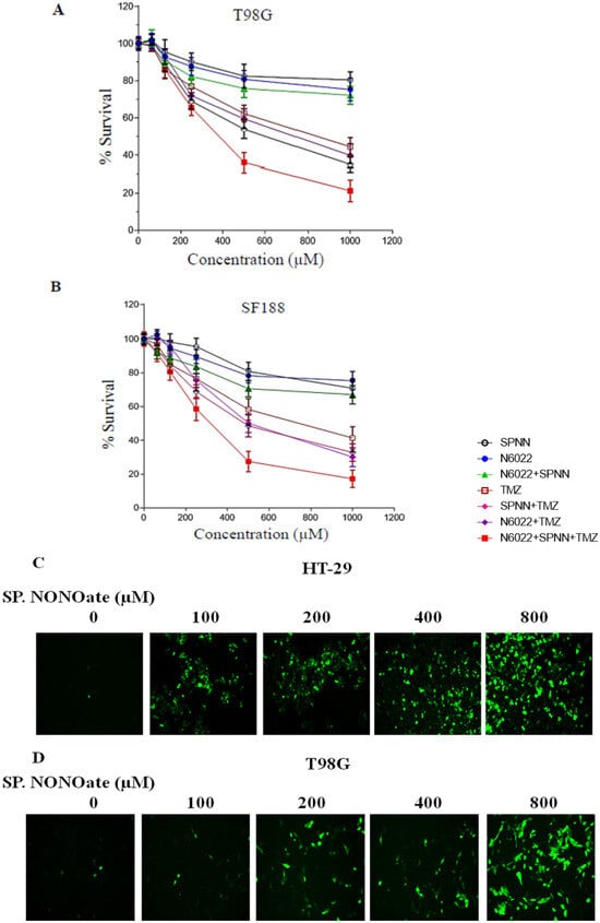 Spermidine NONOate, being a general nitrosylating agent, is expected to have off-target effects influencing multiple processes in cell physiology. Consistent with this postulate, we observed a significant elevation of ROS production in a concentration-dependent manner in HT-29 and T98G cells (Figure 5C,D). Next, we determined the potentiation of temozolomide (TMZ)-induced cell killing by spermidine NONOate. While the nitrosylating agent alone or its combination with N-6022 did not affect the extent of cell-killing, there was a significant decrease in cell survival when the NONOate and the GSNOR inhibitor were combined with TMZ (Figure 5A,B). We calculated a 2-fold increase in TMZ cytotoxicity when the nitrosylator and GSNOR inhibitor were combined.