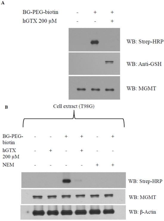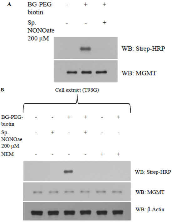 With cysteine residues in particular, the reactive cysteines present on protein surfaces are primary targets of thiolation and nitrosylation. The Cys145 that accepts the alkyl groups is the most reactive cysteine out of five cysteine residues in the human MGMT protein. To dissect the mechanism of whether interference with cys145 of MGMT results in its inhibition by hGTX and spermine NONOate, we used a biotin-labeled O6-benzylguanine (BG) probe (Covalys Biosciences, Berne, Switzerland), which binds specifically binds this cysteine forming a covalent S-benzyl cysteine [18,19,20,21]. In these experiments, purified recombinant MGMT protein was incubated with hGTX or spermine NONOate followed by BG–PEG–biotin along with controls. The reaction mixtures were subjected to SDS-PAGE followed by electrophoretic transfer to PVDF membranes. The protein-bound biotin was detected by using the streptavidin–horseradish peroxidase on the blots. Pre-exposure of purified MGMT protein with hGTX (Figure 6A) and spermine NONOate (Figure 7A) eliminated the binding of BG-biotin. When the same blots were probed with MGMT antibodies, MGMT protein levels were equal in all lanes confirming the lack of binding of the biotinylated BG. Next, we replaced the rMGMT with endogenous MGMT protein by using tumor cell extracts and performing BG-biotin binding assays. Again, treatment of extracts with hGTX or spermine NONOate before labeling with BG–PEG–biotin resulted in the elimination of Western blot signals (Figure 6B and Figure 7B). N-ethylmalamide used as a control to block the active site cys145 of MGMT also prevented the BG labeling of the protein. In the hGTX-exposed samples, GSH antibodies recognized the glutathionylated MGMT protein (Figure 6A, middle blot). These data confirm that hGTX and spermine NONOate modify the active site cys145 of MGMT, by glutathionylation and nitrosylation, respectively, consequently inactivating its DNA repair function.