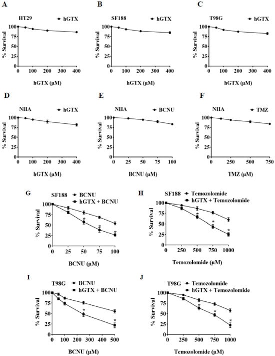 Cytotoxicity of hGTX against MGMT proficient (A) HT29, (B) SF188, and (C) T98G cancer cells. The data show that hGTX alone did not exert significant cytotoxicity. Cell growth inhibition was analyzed with 200 and 400 μΜ for 24 h. In normal human astrocyte culture (NHA) treated with hGTX, BCNU, and TMZ no cytotoxicity was observed (D–F). However, hGTX pre-exposure sensitized the brain tumor cells to the clinically used alkylating agents. (G–J). SF188 and T98G cells were preincubated with 100 μΜ hGTX followed by treatment with different agents using MTT assay. Cells were treated with various concentrations of hGTX (50, 100, 200, and 400 μM), BCNU (250–1000 μM), and TMZ (250–1000 μM) for 24 h. The data represent the results of three independent experiments performed in triplicate. Values are mean ± SD. The results presented in panels (G–J) were significant at p < 0.05. *, indicates a statistically significant difference compared to individual agents (BCNU and temozolomide alone).
