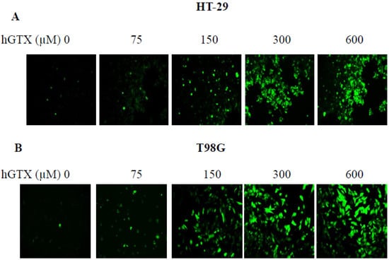 hGTX-induced ROS elevation in HT29 (A) and T98G (B) cells. ROS levels were measured by fluorescence intensity associated with DCF-DA in the oxidative milieu. Tumor cells were treated with hGTX (75, 150, 300, and 600 μM) for 3 h after the addition of DCF-DA. ROS levels were then measured using a plate reader as described in the methods.