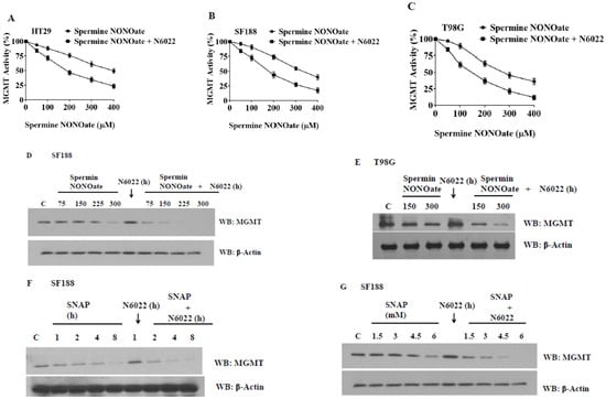 Inhibition of S-nitrosoglutathione reductase (GSNOR) activity results in increased nitrosylation of MGMT by spermine NONOate, and greater inhibition/depletion of the DNA repair protein. Cell extracts were assayed for MGMT activity in panels (A) HT29, (B) SF188, and (C) T98G. Panels (D,E) show the MGMT protein levels in the same experiments. In (F,G), cells were exposed to SNAP (S-nitroso-L-penicillamine), another representative nitrosylating agent. An augmented decrease in MGMT protein when the nitrosylating agents were combined with N6022 is evident. (Whole blot See Figure S9).