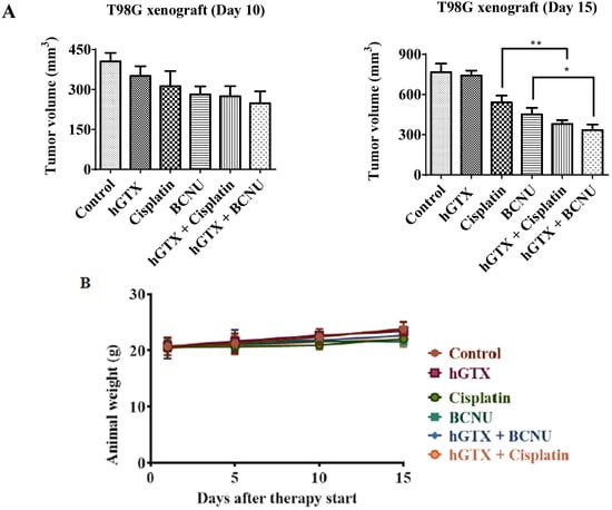 (A) Bar diagrams representing enhanced regression of T98G tumors in hGTX + cisplatin and hGTX + BCNU groups. Tumor volumes shown are mean ± SD. One-way ANOVA followed by Tukey’s post hoc analysis was used to determine significant differences among the groups. These analyses showed a greater decrease in tumor burden in combination of hGTX with cisplatin and BCNU compared to the individual agents alone. * denotes significant difference, * p < 0.05, ** p < 0.01. (B) After 15 days of treatment, there was no difference in the body weights between the vehicle and treatment groups. (C) Altered levels of MGMT and apoptotic regulatory proteins in T98G tumor lysates from xenografts. (Whole blot See Figure S6).