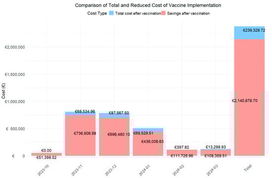 When analyzing the costs associated with the use of the vaccine over two years (Figure 1), the total cost after its implementation is estimated at €239,328.72, resulting in savings of €2,140,878.70 over this period. Furthermore, during the peak epidemic months, the estimated savings would amount to €68,534.96, €87,567.50, and €69,529.51, respectively.