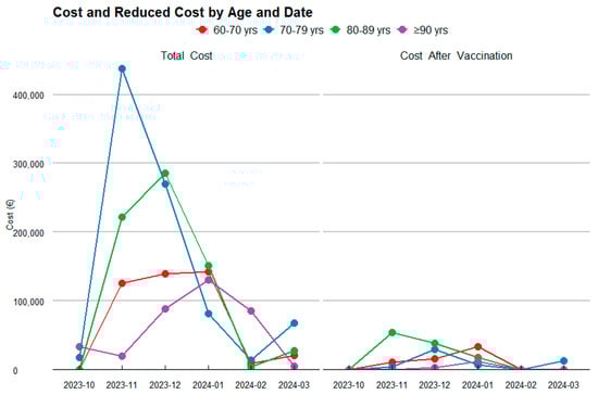 When analyzed by month, the three months with the highest costs during the RSV season were November (€402,720.97), December (€392,023.80), and January (€252,768.07), coinciding with the epidemic peak. During these months, 46 cases, 77 cases, and 70 RSV cases were reported, respectively. With the introduction of the hypothetical vaccine, it is projected that RSV cases will be reduced to 13, 22, and, 23 cases in two years, respectively. This would result in total costs of €13,991.61 and €54,543.35, €13,991.61 and €73,575.89, and €28,528.47 and €41,001.04, representing cost reductions of 96.5% and 86.5%, 96.4% and 81.2%, and 88.7% and 83.8% in each of these months, respectively.
