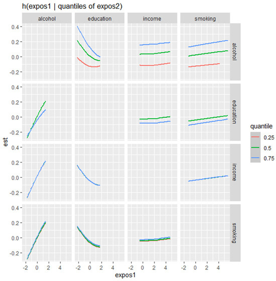 Figure 3 presents the bivariate exposure–response functions of various behavioral and social factors (alcohol, education, income, and smoking) of combined stress and depressive symptoms, displaying how the relationship with each predictor changes across different quantiles of a second predictor, while other predictors are held constant.