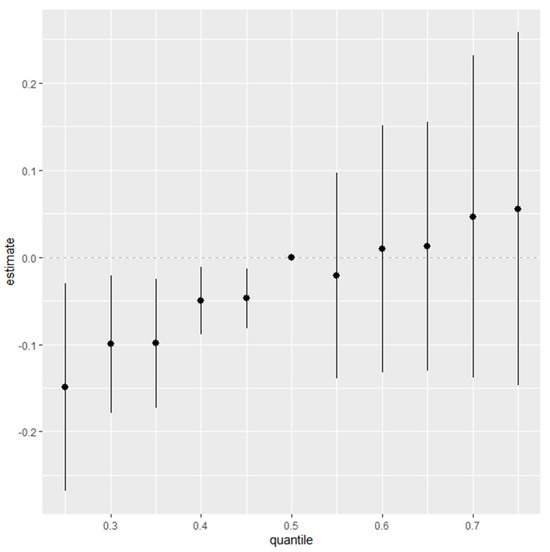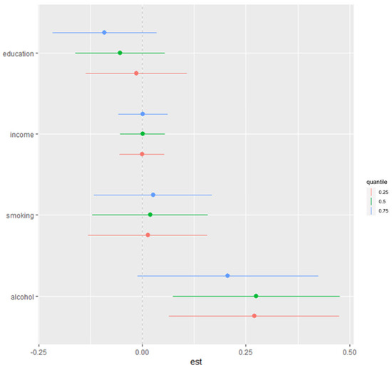 Figure 4 presents a quantile-based summary of the effects of combined social and behavioral factors—alcohol consumption, smoking, income, and education—on stress and depressive symptoms. This analysis examines the estimated impact of these factors across various quantiles, from the 25th to the 75th percentile, relative to the median. Each point on the plot represents the estimated effect at a specific quantile, with vertical bars indicating the credible intervals around each estimate.