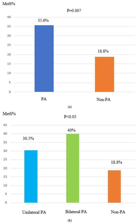 This higher prevalence of MetS was particularly evident in individuals with bilateral PA, who exhibited a markedly greater prevalence of MetS than those with unilateral PA (41% vs. 30.5%; p = 0.001) (Figure 2b).