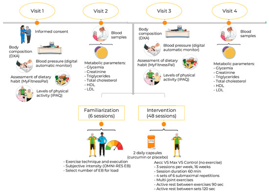 Juesas, A.; Saez-Berlanga, A.; Babiloni-Lopez, C.; Martin, E.G.; Garrigues-Pelufo, L.; Ferri-Caruana, A.; Gene-Morales, J.; Martin-Rivera, F.; Chulvi-Medrano, I.; Jiménez-Martínez, P.; et al. Effects of Accentuated Eccentric and Maximal Strength High-Resistance Training Programs with or Without a Curcumin-Based Formulation Supplement on Body Composition, Blood Pressure, and Metabolic Parameters in Older Adults. Diseases 2025, 13, 62. https://doi.org/10.3390/diseases13020062