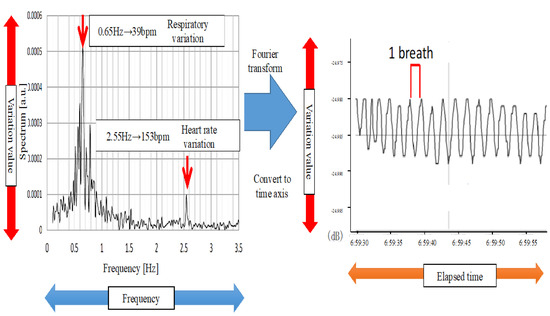 The quartz optical fiber sheet was laid on the infant’s bed in the hospital room. The infant was put to sleep as usual. The measurement start/end button on the control unit was pressed to measure the infant’s breathing status during sleep and again upon waking up to end the measurement. The overnight measurement data were stored on the SD card in the control unit. The frequency of the measured data was converted to the time axis through Fourier transformation (Figure 2). The results were presented as the RDI, which was measured by the F-SAS Sensor® on an hourly basis [15].