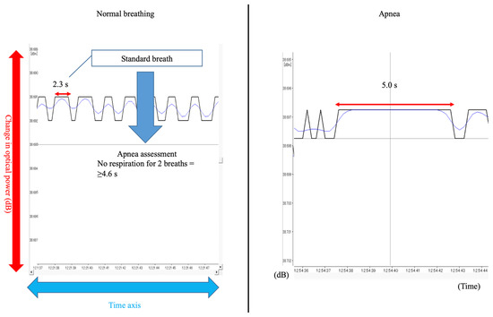The duration of one breath (s) was calculated from the stable breathing waveform and multiplied by two to determine the threshold for diagnosing apnea. As shown in Figure 3, the duration of one breath was determined as 2.3 s, and infants with a flat baseline for at least 4.6 s (two breaths) were diagnosed with apnea.