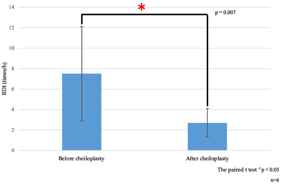 Compared with preoperative values, the mean RDI showed a significant reduction postoperatively both for cheiloplasty (7.5 vs. 2.7 events/h, p = 0.007; Table 3 and Figure 4) and palatoplasty (4.4 vs. 1.7 events/h, p = 0.010; Table 3 and Figure 5). This indicated postoperative improvement in the sleep breathing status.