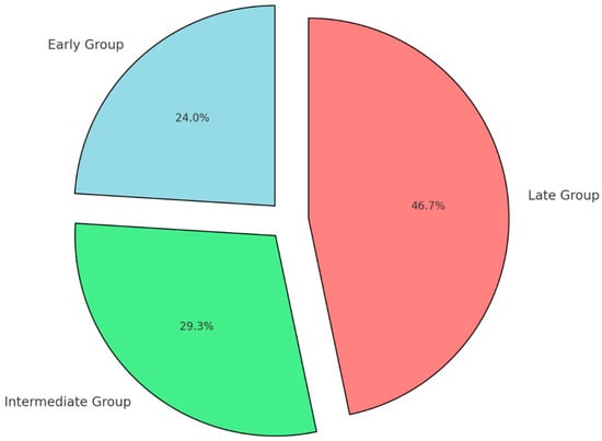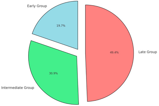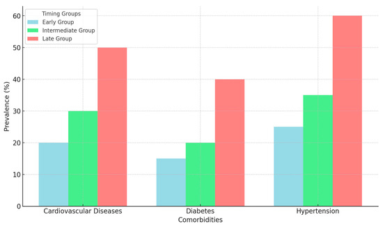 Comorbidities were more prevalent in the late group, particularly cardiovascular diseases, diabetes, and hypertension, which were significantly more common in the late group compared to the early and intermediate groups (p < 0.05) (Figure 2).