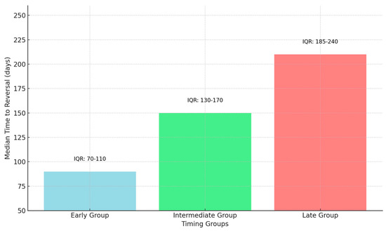 The median time to reversal was 90 days (IQR: 70–110) in the early group, 150 days (IQR: 130–170) in the intermediate group, and 210 days (IQR: 185–240) in the late group.