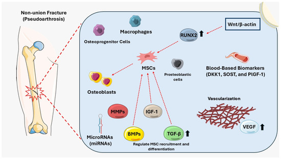 In summary, crucial factors contributing to non-union include impaired vascularization, MSC dysfunction, dysregulated growth factor signaling, cellular senescence, excessive MMP activity, and miRNA dysregulation (Table 1, Figure 1) [6,16]. Blood biomarkers, such as B7-1, PlGF-1, and other BTMs, offer promising tools for predicting and monitoring fracture healing [56]. Furthermore, addressing infections and promoting angiogenesis and MSC function may provide effective therapeutic strategies for preventing non-union [27].