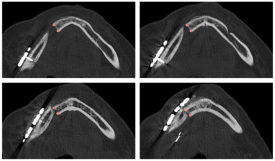 Points defined by the surgeon in four axial views of the postoperative CT scan for identifying the intraoperative resection plane.