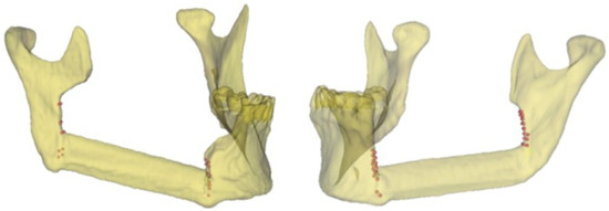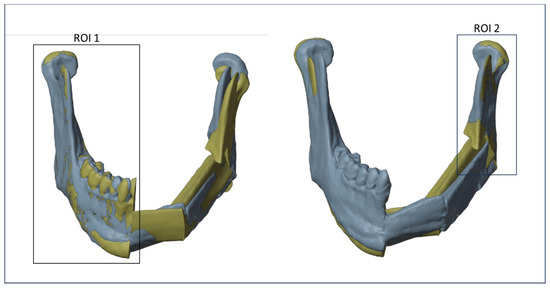 To minimize errors, two different registrations between the planned and the postoperative models have been realized using different regions of interest (ROIs), once for each osteotomy. As shown in Figure 6, the first ROI, consisting of the right mandibular ramus and body, was used to evaluate the discrepancy between the planned and the intraoperative mandibular body osteotomy, while a second ROI, consisting of the left mandibular ramus, was used to evaluate the discrepancy between the planned and the intraoperative mandibular ramus osteotomy. The definition of ROIs has been evaluated for each patient.