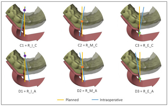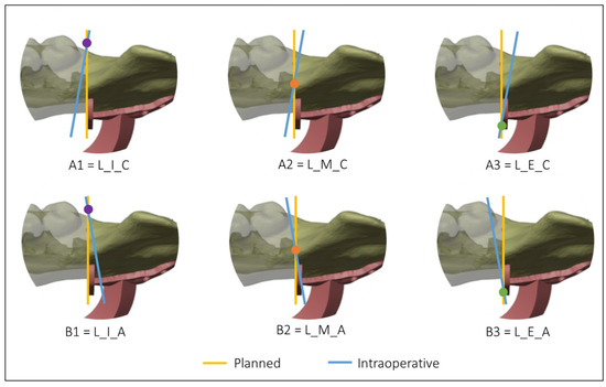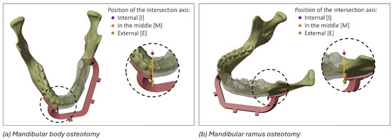 The details of a mandibular body osteotomy highlighting the three regions (i.e., internal, external, or in the middle) where it is possible to identify the intersection axis between the planned and the actual resection plane is reported in Figure 3.