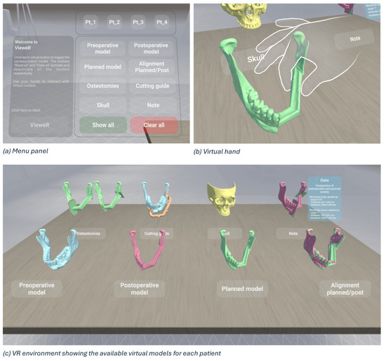 By interacting with the menu panel, the models can be toggled on/off one at a time for a more precise display, or all at once (“Show all” and “Clear all” buttons in Figure 8a). We have deliberately designed a simple, easy and intuitive environment, as shown in Figure 8c, so that virtual reality represents only an advantage, a valuable and effective tool, and in no way an obstacle for a non-expert audience. Indeed, the Meta XR Interaction SDK for Unity has been set to interact in an immersive manner with the virtual environment, allowing surgeons to grab objects, press buttons, and navigate user interfaces physically using their hands (Figure 8b).