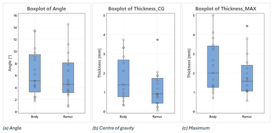 In this analysis, boxplots showing individual values have been used to assess and compare the shape, central tendency, and variability of sample distributions related to osteotomy procedures. Body and ramus data have been plotted on the same graph to compare the distribution based on the three key metrics: the angle between the planned and the intraoperative osteotomy (Figure 9a), the thickness at the centre of gravity (Figure 9b), and the maximum thickness of the deviation volume (Figure 9c).