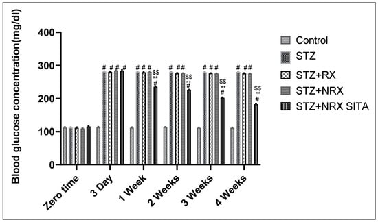 Effect of streptozotocin (STZ) (60 mg/kg single i.p.), rivaroxaban (RX) (5 mg/kg orally for 4 weeks), nano-rivaroxaban (NRX), and combined treatment of NRX + SITA (10 mg/kg orally for 4 weeks) on blood glucose level in diabetic rats. Data represented as mean ± SE of ten observations. # Significant difference at p < 0.001 in contrast to the control group. ** Significant difference at p < 0.001 in contrast to STZ group. $$ Significant difference at p < 0.001 in contrast to NRX group.