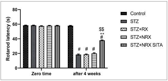 Effect of streptozotocin (STZ) (60 mg/kg single i.p.), rivaroxaban (RX) (5 mg/kg orally for 4 weeks), nano-rivaroxaban (NRX), and combined treatment of nano-rivaroxaban and sitagliptin (10 mg/kg orally for 4 weeks) (NRX + SITA) on rotarod staying time. Data represented as mean ± SE of ten observations. # Significant difference at p < 0.001 in contrast to the control group. ** Significant difference at p < 0.001 in contrast to STZ group. $$ Significant difference at p < 0.001 in contrast to NRX group.