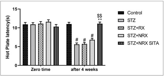 In terms of pain sensitivity, streptozotocin-induced diabetes resulted in hyperalgesia, evidenced by a significant reduction in hot plate latency after 4 weeks of treatment. This reduction was observed in the STZ, RX, and NRX groups compared to the control group. However, combined NRX + SITA treatment significantly enhanced hot plate latency in diabetic rats when compared to the STZ- and NRX-only groups. No significant difference in hot plate latency was found between the RX and NRX-treated groups compared to the STZ diabetic group (Figure 3).