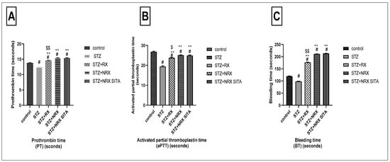 Regarding BT, a significant reduction was observed in the STZ diabetic group compared to non-diabetic rats. However, treatment with RX, NRX, and NRX + SITA resulted in a substantial increase in BT, significantly improving clotting function compared to the diabetic group (Figure 4C).