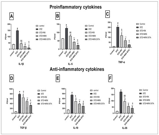 This study evaluated the impact of RX, NRX, and their combination with SITA on serum levels of pro-inflammatory (IL-1β, IL-6, TNF-α) and anti-inflammatory cytokines (TGF-β, IL-10, IL-35) in STZ-induced diabetic rats. STZ injection significantly increased all measured cytokines compared to control rats, indicating an inflammatory response.