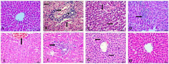 In the RX-treated group, these changes were somewhat alleviated, with mild congestion of the central vein and peri-portal lymphocytic infiltration observed (Figure 6E,F). The NRX-treated group showed improvement, with most hepatic alterations reduced, though some instances of vacuolar degeneration remained (Figure 6G). The combination treatment of NRX + SITA demonstrated near-normal hepatic architecture, with normal hepatic cords observed, indicating substantial recovery (Figure 6H).