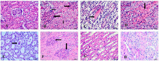 Tissue samples from the kidney, liver, pancreas, and spleen were fixed, dehydrated in ascending grades of ethyl alcohol, and cleared with xylene before being embedded in paraffin wax. Paraffin blocks were sectioned into 4 μm slices, mounted on slides, and dried overnight at 37 °C before hematoxylin and eosin (H&E) staining. The stained sections were examined under a light microscope (Olympus CX31; Tokyo, Japan), and images were captured using a digital camera (Toupview, LCMos10000KPA, China) [33].