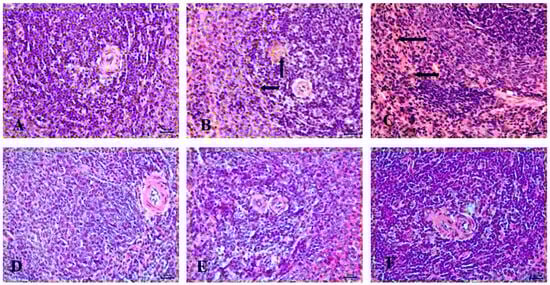 Histopathological examination of the spleen stained with Hematoxylin and Eosin (H&E). (A) control animals with healthy white pulp, (B) STZ-induced diabetic animals with severe hemosiderosis in red pulp (arrow), (C) STZ-induced diabetic animals with severe hemosiderosis in white pulp (arrow), (D) RX-treated group, (E) NRX-treated group, and (F) NRX + SITA-treated group showing normal white pulp. Scale bar = 20 µm.