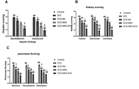 Histopathological scoring revealed significant improvements in liver, kidney, and pancreatic tissues across the treatment groups, particularly in the NRX + SITA combination group.
