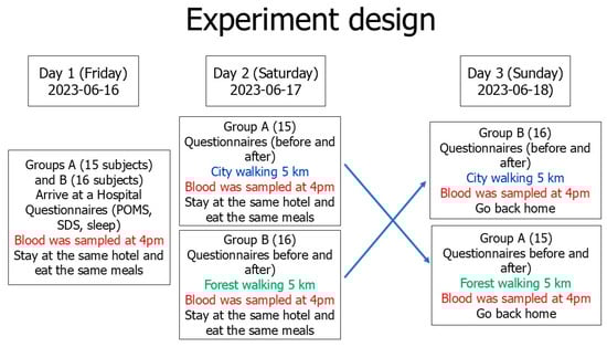 - Because we used the randomized crossover design, all subjects experienced forest bathing and urban walking, even though the participants experienced the forest and city treatments on different dates. The differences in participants’ responses to the two different environments could be analyzed.