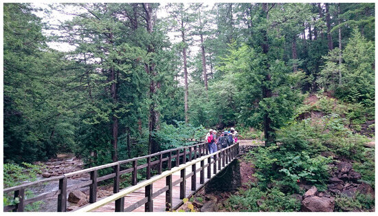 - As another limitation of this study, various factors such as deep breathing, differences between forest and urban in ambient illuminance, temperature, and humidity, the inclines and declines during walking and the conditions underfoot while walking, may affect blood serotonin and oxytocin concentrations and symptoms of depression; however, in this study, it was not possible to exclude the influence of some of these factors. In addition, this study was a field study, not a laboratory experiment; therefore, it is difficult to control all confounding factors. This should be addressed in the future research. However, both the city walking route (Figure 4) and the forest walking route (Figure 2 and Figure 3) are flat roads, and the forest walking route is wheelchair accessible. Therefore, the impact of the differences in the inclines and declines between city walks and forest walks should be limited. In fact, the effects of forest bathing are the total effect of the forest environment, including the quiet atmosphere, beautiful scenery, calm climate, pleasant aromas, and clean fresh air compared with city environments.