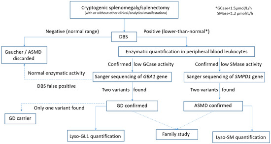 - To investigate if any of these patients could be affected by the GD and/or ASMD, by using enzymatic quantification with DBS testing as a diagnostic tool. Furthermore, we want to prove the usefulness of DBS testing as a simple, fast, and effective method for diagnosing and/or ruling out these two diseases. Analysis of the allelic variants found in confirmed GD or ASMD patients was performed.