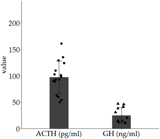 Studies of ACTH and GH secretion capacity exist. Plasma ACTH levels in non-anesthetized, unstimulated rats reportedly increase immediately after the onset of stress, attaining nearly maximum levels (932 pg/mL) 5 min thereafter, and this elevated level persists for 60 min before gradually decreasing [29]. Although plasma GH levels vary by sex and age, female rats generally exhibit higher plasma GH concentrations than males, with mean concentrations of 94.2 ± 17.3 ng/mL in females and 54.9 ± 12.0 ng/mL in males [30]. In aged rats, the peak GH concentration reportedly reaches 200–300 ng/mL [31]. In adult men, the mean peak ACTH value during a CRH stimulation test (nine subjects) was 56.8 ± 3.2 pg/mL [32], and the mean peak GH value during a GHRP-2 stimulation test (eight subjects) was 68.7 ± 15.5 ng/mL [33]. In our study, the mean peak ACTH value on CRH stimulation testing was 97.2 pg/mL, and the mean peak GH value on GHRP-2 stimulation testing was 25.1 ng/mL. The average ratio of the peak values of ACTH to GH after stimulation was 1:258.2. These values may serve as a benchmark for ACTH and GH secretion levels in future human cell transplantation.