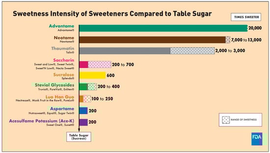 Sweetness intensity of NNS compared to table sugar, as proved by FDA [48]. (accessed on 1 March 2025).