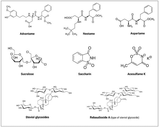 Up till now, the FDA has approved six NNS as food additives [51]. These include advantame, neotame, sucralose, saccharin, aspartame, and acesulfame K (Table 1, Figure 3) [52]. In addition, stevioside and rebaudioside A, two naturally derived sweeteners from stevia (Stevia rebaudiana) extracts and monk fruit extract (Siraitia grosvenorii), respectively, are FDA-recognized as safe (GRAS) zero-calorie sweeteners [53,54].