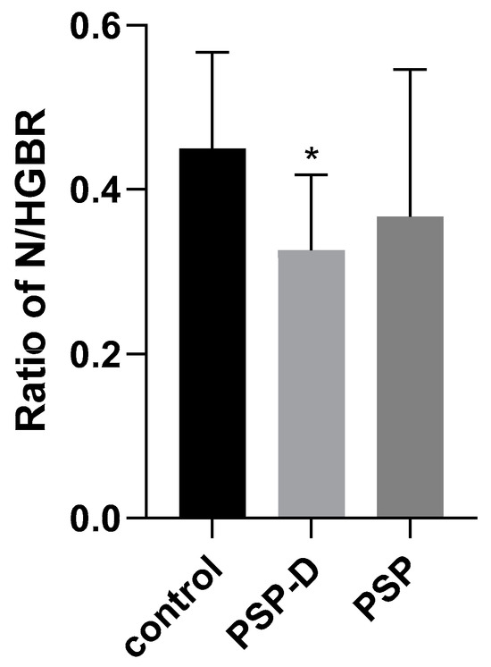 The mean N/HGBR for the PSP cohort was 0.4 (SD = 0.2; range: 0.2–0.6) and was significantly higher than for the PSP-D group (mean score: 0.3; SD = 0.1; range: 0.2–0.4; p = 0.01) (Table 1). For parameters with group-to-group differences showing statistical significance, the neutrophil count was also determined (p = 0.04) (Table 1).