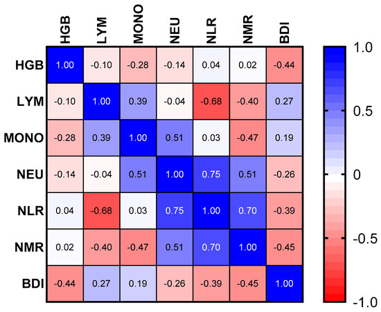 Pearson’s correlation analyses were performed to explore the relationships between the N/HGBR and various clinical and inflammatory variables, including HGB, LYM, MONO, NEU, NLR, NMR, and BDI. The results of these analyses are summarized in a correlation matrix, with further details presented in a heatmap visualization (Figure 2).