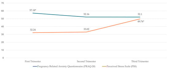The PRAQ-20 scale shows high internal consistency, with values like those obtained in the Spanish validation study [24] above 0.90 in all trimesters. It was found that the prevalence of anxiety was statistically higher during the first trimester, being present in 23.9% of the participants. It was 17% and 17.6% during the second and third trimesters. This decreasing evolution of the percentage of anxiety with a slight increase during the third trimester, although not significant for this study, is like that previously obtained by other authors [24,26]. When different versions of the PRAQ-20 with fewer items are used, such as the PRAQ-20, mean anxiety values slightly lower than those in our study are obtained [28,37].