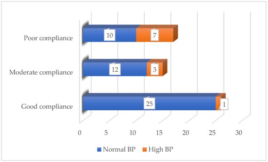 During the 4-month follow-up period, we noted a significant decrease in the number of patients with elevated blood pressure. Prior to the diet, 27 (46.55%) children were diagnosed with AH, and 12 of them required antihypertensive therapy. At the end of the diet, only 11 (18.96%) children continued to have elevated blood pressure, and only 6 of them needed antihypertensive medication. Good compliance with the diet was associated with better final outcomes—in the group with good compliance, only one patient remained with high blood pressure, (Figure 2). At the end of the study, there was no significant change in mean uric acid levels (p = 0.37).